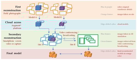Brick construction constitutes a systematic application of materials and the interface that connects adjacent parts. The complexity of such a system demands real-time communication, which is supported by the interactive manipulation of inspected parts with photo-realistic details from a remote heritage site. Value can be added to the AR process by means of interaction, composition, communication, confirmation, and recursion in the development of the warehouse and its preservation attempts. Compared to AR remote assistance methods such as “see what I see” (performed by incorporating multiple sources [,,]), we evolved the paradigm of “reconstruct what I interact with” to confirm and share remote spatial interrelationships during AR-enabled interaction. The novelty of video conferences redefined the connection between processes and configurations through a looped interaction between AR and 3D models for morphology, conservation, and situated comparisons. We found that a former reconstructed result could be remodeled as a reference for the follow-up reconstruction process. The first and second reconstructions presented architectural details synchronously in video conferences or asynchronously in broadcasting. A cross-comparison between warehouses illustrated the differences between warehouses with the side-by-side allocation of details from both halves of each site. The additional visual quality of the obtained models was presented in color RP models (first and second reconstruction) and digital models (second reconstruction).