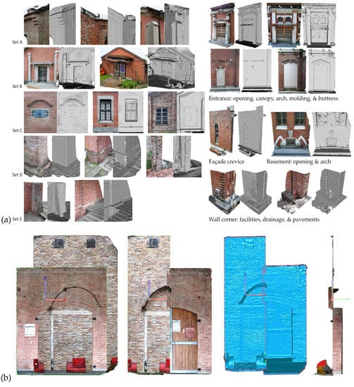 (a) Examples of the first reconstructed components; (b) two arches of different spatio-temporal backgrounds presenting different curvatures, endings, and numbers of brick layers above openings.