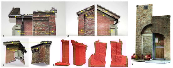 Verifications of the original first reconstructed models, the base models, were obtained through a 3D printing process (Figure 4). The links and names in Figure 4 indicate the details used for comparison with those from different warehouses. The eaves, moldings, columns, and buttresses presented different construction methods and structural supports. In addition to different brick types, structural members chose different finishes and illustrated a contrast of traditional styles.