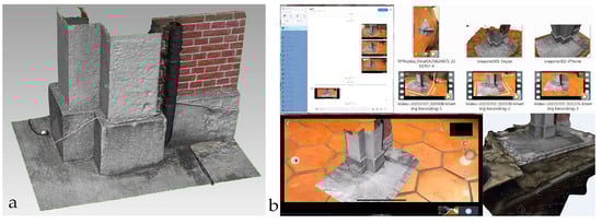 Feature abstraction and comparison constituted the basic architectural study process to articulate and inspect professional knowledge. In place of the scan-to-AR method [], the photogrammetry-to-AR method proved to be an efficient modeling process, especially when the same ubiquitous smartphone device was used to take pictures and simultaneously interact with a real environment when examining on-site variations. Three-dimensional AR models (Figure 3, top) have attracted attention and supported photogrammetric reconstruction modeling of mutual relationships. The simulation was also immediate and user-friendly, relating the two first reconstructed components in different spatio-temporal backgrounds (Figure 3, bottom).