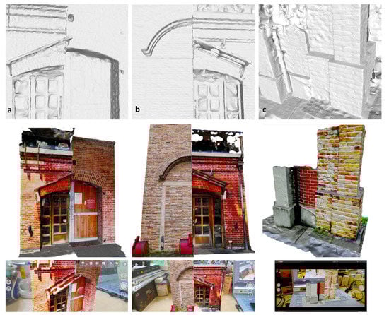 Two additional sets of pair-comparison models are included in Figure 7a,b to represent the new improvements made to the first reconstruction. The two comparisons illustrate different designs of building entrances and façades, with greatly improved visual details. The models were created in a high detail mode and at a smaller scale, so that the movement of the smartphone camera could enhance AR details in a closer range while simultaneously covering the entire 3D model in as many frames as possible.