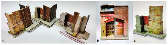 3D color-printed models created from original first reconstructions to (a) relate brick texture and context with the eaves, moldings, columns, and buttresses of two warehouses from different orientations; (b) illustrate brick joints in a plain-colored FDM model; and (c) reveal differences between two arches above the exterior door.