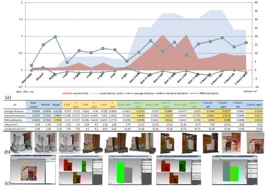 (a) Deviation analysis; (b) base sets (the left three models), small geometry sets (the middle three models in six comparisons), and larger building part sets (the right five models in 10 comparisons); (c) screenshots of deviation analysis for the secondary reconstructed model and 2 door2-left & 2 door2-right in Geomagic Studio®.