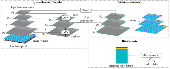 In the second part of the model, a multi-scale decoder is considered. Here, high-level textures are fed to the decoder directly from the pyramid-context encoder, and low-level features are fed from ATNs as depicted in Figure 2. A combination of low-level features and high-level texture information provides building objects that are even missing in the masked region [45].