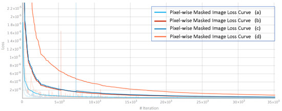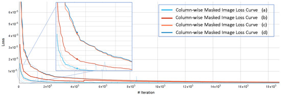 In Figure 14, different curvatures are observed for different levels of missing data. With the higher corruption on the image, loss function converges to the highest error value. Also, it requires dramatically longer iterations to converge to a steady value. The highest convergence is observed on the softest case, column-wise missing data. In the long run, error value converges to a lower values. However, since column-wise missing data is a more challenging recovery case, loss curves of the and overlap and converges to their minimum levels after 15,000 iterations. Also, decreasing trend in PSNR values are interrelated with the loss curves.