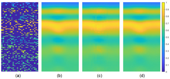 As in the pixel-wise missing case, the simplest scenario is started from missing rate for column-wise missing data and this is presented in Figure 11a. The original raw GPR image is given in Figure 11b. As seen in the column-wise missing image, the target signature can be partially observed. The visual results are quite similar since this is the simplest scenario as seen from Figure 11c–h. All the methods have successfully recovered the missing GPR image entries. Thus it is hard to choose the best performing algorithm from visual results.