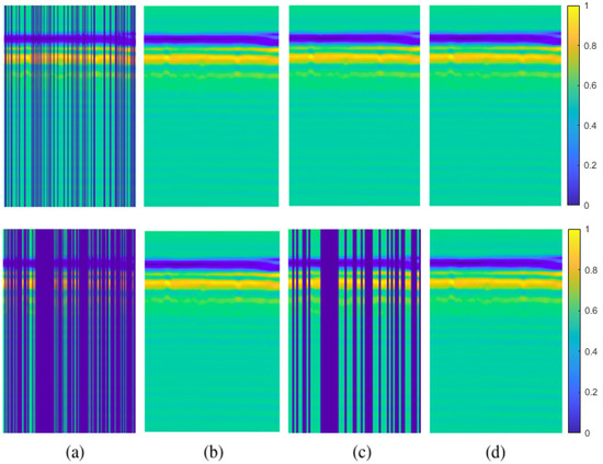 First row 30% and second row 50% column-wise missing data case for real data-II: (a) GPR image with missing entries, recovered images by (b) original GPR image, recovered images by (c) NNM, (d) DIP.