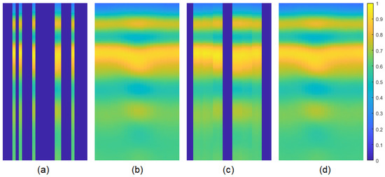 The extreme column-wise missing case is shown in the second row of the Figure 23a and the targets are barely visible. Especially, the first and last two targets are completely corrupted by the missing columns compared to the original real data-II in Figure 23b. The visual results are presented in Figure 23c,d. NNM algorithm can not recover the missing columns as expected due to the high number of missing columns, the columns are concatenated into blocks and NMC fails at this part. However, DIP algorithm can successfully recover the missing GPR image even in the extreme case. The presented visual result in Figure 23d shows the efficiency of the recovery.