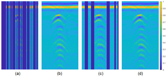 Aside from its advantages, GPR-based detection also presents various challenges. GPR data collection is especially highly vulnerable to situations such as difficult access to some regions, extremely damaged or corrupted A-scans, data with clutter that makes objects less visible, failures during data acquisition or some instrumental problems. As a result of these situations, partial information loss is a very common problem in capturing GPR measurements. Moreover, missing data leads to poor performance of clutter removal, decreased imaging capability [2,3] and poor interpretation, identification, and analysis of GPR data. Various data recovery methods are introduced in the literature for natural images and seismic data. In general, these methods are based on interpolation [4], matrix completion [5] or more recently on deep networks [6].