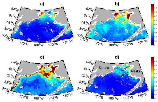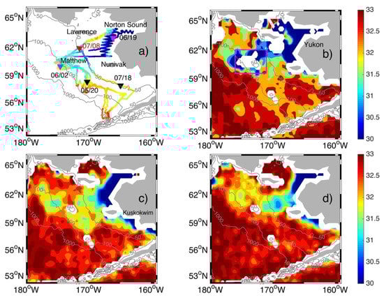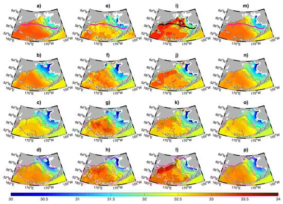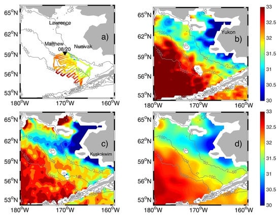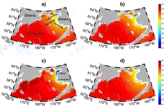 The fundamental processes modulating salinity variability in the shelf region include seasonal ice formation-melting cycle and river runoff. Sea-ice cover is a defining characteristic for the Bering Sea. Despite the strong year-to-year fluctuations, sea ice normally starts to develop in the northern Bering Sea in November when the temperature drops to the freezing point (approximately −1.7 °C). Sea ice formed in the northern shelf advances southward under prevailing north-north-easterly winds [,]. Melting near the ice edge provides sizable freshwater to reduce the local salinity []. The maximum ice extent typically occurs in March and can cover almost the entire eastern shelf []. There are dramatic changes for the ice duration in the southern shelf where the seawater is often warmer than its freezing point. The spring melting and northward retreat of ice induce substantial salinity variability in the upper ocean [,]. In parallel, coastal river discharge becomes important in summer. The Yukon River and the Kuskokwim River are the major sources for freshwater, and their plumes create sharp salinity gradients [,,,]. With the breakdown of the inner front in late summer, this low-salinity signature spreads out over the shelf [].