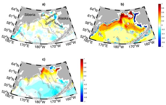 The Bering Sea is a semi-enclosed, sub-arctic marginal sea in the North Pacific. Its bathymetry is almost equally divided by a deep basin and continental shelves. The eastern shelf is broad and stretches more than 500 km zonally and 1200 km meridionally (Figure 1). This contrasts with the narrow shelf (<100 km) in the west []. The eastern shelf has received considerable attention as it hosts intense interactions among ocean, ice, and atmosphere. The changing physical environment is capable of modulating the local ecosystem, which supports abundant seabirds and marine mammals as well as some of the United States’ most productive and commercially important fish species [,].