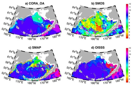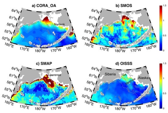 The overall SSS variations are quantified by standard deviation (STD). Gulf of Anadyr and Norton Sound are hotspots for the elevated variability (STD > 1) due to sea ice formation/melting and river discharges (Figure 3). OISSS displays much lower STD over there, suggesting that more realistic signals are excluded in its quality control process. There are also remarkable variabilities around St. Lawrence Island and Nunivak Island, but they are only pronounced in SMAP. They are not necessarily bias as dramatic salinity changes were documented in this area [,,]. In contrast, SMAP also includes high STD along the east coast of Siberia, which is very likely to be uncertainties/errors near the land.