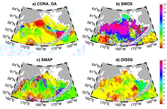 The maximum and minimum of the annual cycle are taken as average of the topmost 5% and lowest 5% values, respectively, over 2015–2020 from the four products. This approach is to reduce the uncertainty due to noises in satellite data and some accidental influencing factors. The difference between maximum and minimum are defined as the amplitude for the seasonal SSS variability. The overall patterns for the amplitudes are similar to the STD fields in Figure 3, indicating that substantial variability takes place on the seasonal time scale. Gulf of Anadyr carries the largest amplitude (Figure 5). It is more than 2 PSS-78 for CORA_OA, SMOS and SMAP, but is only about 0.8 PSS-78 in OISSS. Large values are also found around St. Matthew Island in SMOS and SMAP. The peak-to-peak ranges in deep ocean are quite weak (~0.2–0.3 PSS-78) in CORA_OA and OISSS. SMOS and SMAP, however, exhibit much noise in the deep ocean and their amplitude can reach up to 0.7–0.8 PSS-78 in some regions.