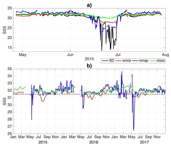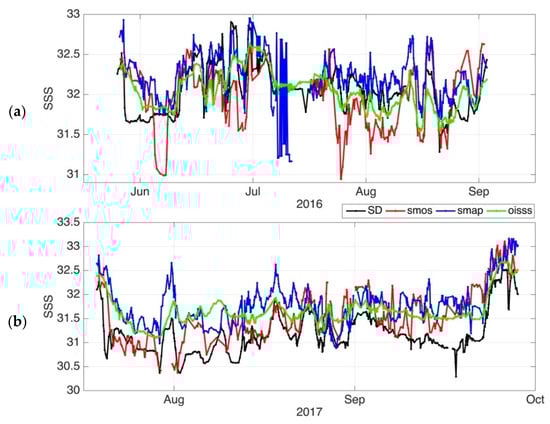 Time series of salinity measured by CTD on saildrone (black) and collocated SSS from SMOS (red), SMAP (blue) and OISSS (green). Measurement from SD128 in 2016 and SD1001 in 2017 are displayed in (a,b), respectively.