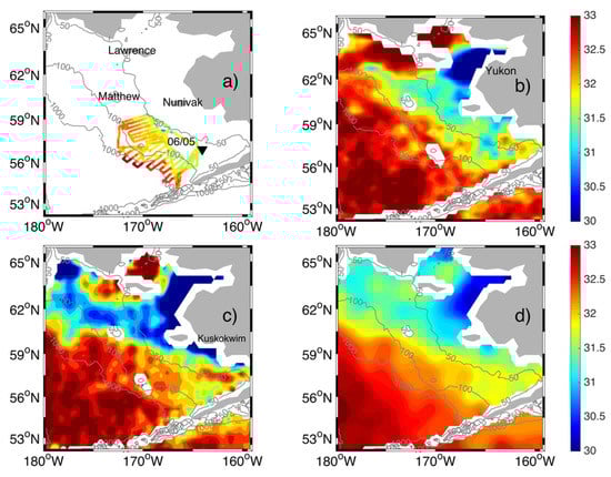 Saildrone vehicles SD126 and SD128 were deployed again on 23 May 2016 and recovered on 3 September. They stayed in the southern part of the shelf (south of 59° N). SD128 approached a mooring M2 (black triangle in Figure 10a) in early June. It recorded salinity values around 31.6 PSS-78. Satellite maps also exhibit relatively low SSS near the mooring during this period (Figure 10). Another striking feature captured by satellite data is a large area of coastal freshwater north of 59° N. Despite different values in SSS, all three satellite products reveal that a freshwater belt connects the Yukon River plume and the low SSS possibly induced by sea ice melting north of St. Matthew Island. This was formed under offshore winds. A similar event also took place in 2017, which will be discussed in the following section.