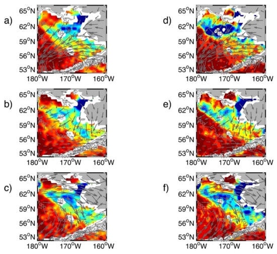 Winds are extracted from the National Center for Environmental Prediction (NCEP) North American Regional Reanalysis (NARR) model hindcasts []. The NARR reanalysis dataset includes surface pressure, wind, temperature and ocean-atmosphere heat fluxes every three hours. Here, only the daily mean winds are utilized to match the satellite maps. Its spatial resolution is about 32-km. This wind field was selected to examine the relationship between wind and ocean velocity in the eastern Bering Sea shelf [].