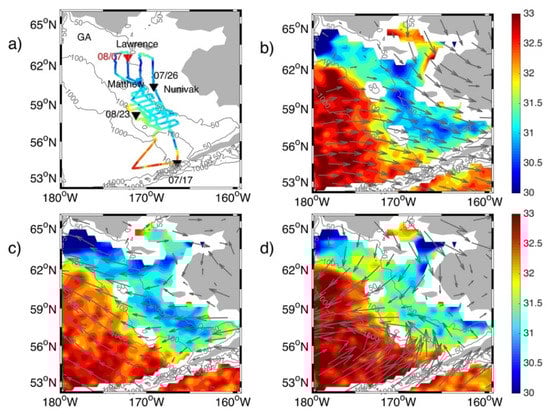 From about 20 July, a few days after SD1001 was launched, surface wind force switched to westerly and north-westerly again. This then triggered the southward expansion of low salinity near the Yukon River and the Kuskokwim River. The SMOS map and SD1001 data both confirmed that the southern shelf was widely occupied by low SSS waters (Figure 14a,b). The wind became adverse for southward transport in August but supported the westward water movement north of St. Matthew Island (Figure 14c). Surface salinity in the southern shelf on 23 August was larger than in early August, likely resulting from horizontal and vertical mixing processes (Figure 14d).