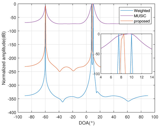 In Figure 3, the simulation is based on a eight-sensor uniform linear array with half-wavelength sensor spacing. The results show that the weighted method can distinguish two sources separated only by 3° with 200 snapshots and .