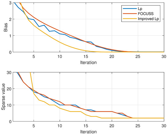 The adaptive methods can not only reduce the influence of the artificial selection of parameters on the results but also speed up the algorithm convergence to a certain extent. The convergence speed of the proposed algorithm was improved under the combined effect of acceleration strategy and adaptive methods. Figure 5 shows that the improved method will converge before 18 iterations, and the original method of and the FOCUSS algorithm requires nearly 24 iterations to converge.