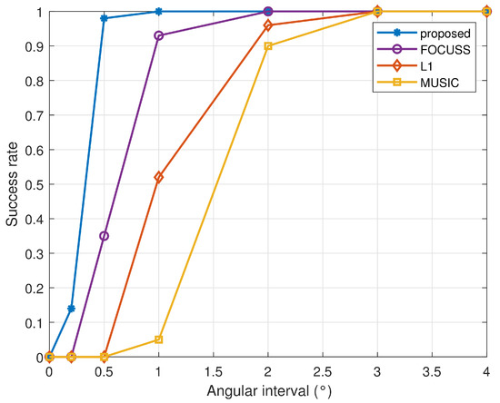 Assume two equal-power uncorrelated signals arrive from 0° and , respectively, where is varied from to 4°. The SNR is set to 0 dB, and the number of snapshots is 200. The statistical result obtained via 200 multi-snapshot trials is shown in Figure 6 with the correct rate versus angular separation. As is clear from the figure, the proposed algorithm had a better ability to distinguish two closely spaced signals.