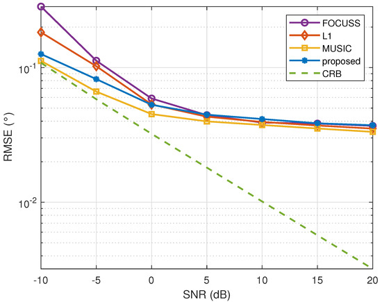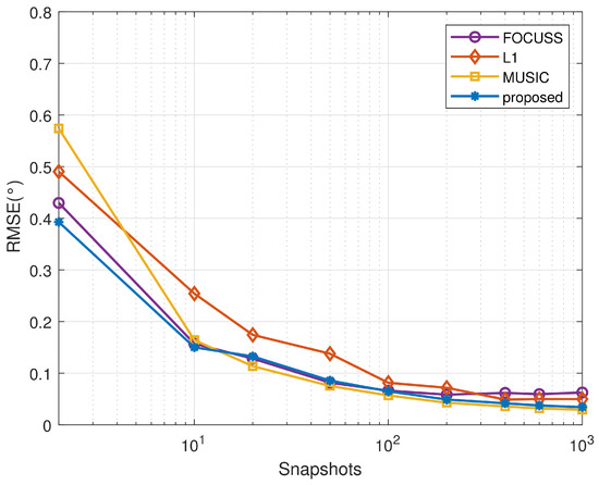 The bias curves in Figure 7 were obtained via 200 independent trials. Every multi-snapshots trial had a different DOA, and , drawn within the intervals and , and the snapshot number was 200. The root mean square error (RMSE) curves for different SNRs show that the resolution of the proposed algorithm meets the existing sparse reconstruction algorithm standards. Since the set grid size is , when the SNR is high, the resolution of these algorithms is limited by the grid, and the curves will gradually become flat.