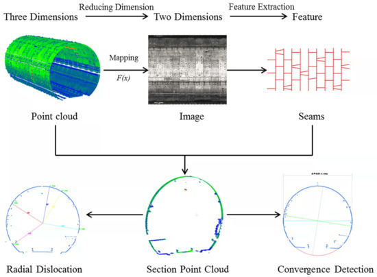 Traditional monitoring methods rely on manual measurements. However, inspectors can only conduct inspections within a limited skylight time to ensure normal operation of a subway. The average detection time is 2–2.5 h/day. Given this time limitation, inspectors can only focus on disease-prone areas, easily resulting in missed inspections [7,8]. In addition, blurred photos and inaccurate records were obtained because of the dark internal environment of the tunnel. Therefore, the overall detection efficiency of this method was inadequate. Mobile laser scanning (MLS) technology has the advantages of no contact and no external light source required and has higher precision and efficiency than traditional methods [9,10,11]. These characteristics make MLS technology widely recommended and adopted by many institutions and researchers to detect tunnel structure disease [12,13,14,15].