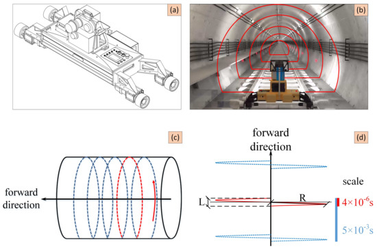 where R is the tunnel radius and L is a quarter of the pitch of the scanning spiral line (Figure 2). When the carrier is traveling at 3 km/h, the distance between the start and end points of the scan line is mm. Given the tunnel’s inner radius of 2.7m, the calculation error according to Equation (1) is mm, which can be ignored.