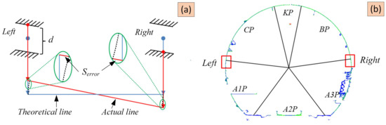 The location of the convergence diameter endpoint is determined by offsetting the center position of the given transverse seam on both sides; thus, the transverse seam position generates inaccuracy in the convergence diameter detection result. In the worst-case scenario, the transverse seams on the left and right sides are at the top and bottom of the seam, respectively (Figure 3). The inaccuracy produced by the convergence diameter detection result is the largest at this moment, and it may be calculated using Equation (2):