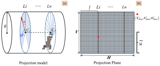 The shield tunnel has the characteristics of a linear distribution and a nearly circular section; thus, the cylindrical model was used as the projection plane. In a single section, the geometric center of the tunnel section is used as the viewpoint. Based on the scanning angle, the image mapped by the laser points in the section can be regarded as an orthophoto. The distortion of its geometric features is negligible, and the projection conversion relationship between the laser points and pixels is simple and clear. The projection is convenient for subsequent feature extraction and conversion between the image and point cloud (Figure 4).