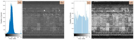 The inner wall of the tunnel is made of concrete; thus, the corresponding laser reflectivity is basically the same. The grayscale image of the inner wall of the tunnel generated in the prior step shows that the overall color is dark, the change in light and shade in tone is small, and the characteristics of tunnel segment cracks are indistinct (such as in Figure 5). Therefore, the image must be further enhanced to ensure that the mapped grayscale image has a high contrast hue and obvious feature information. Histogram equalization is adopted in this case, that is, the distribution range of the pixel value is stretched to expand the range of two levels [25], as shown in Figure 5.