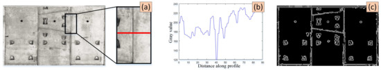 After the grayscale image is enhanced by histogram equalization, the segment seam shows significant changes in the brightness of local areas in the image; that is, the value changes sharply in a small local neighborhood (Figure 6). Therefore, the segment seam can be obtained by two processes: feature detection and extraction of grayscale images. Specifically, the combination of the Canny algorithm and Hough transform is used to identify and extract tunnel segment seams [26,27].