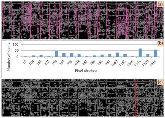 Hough transform to extract vertical straight lines: (a) Hough transform detection results; (b) pixel statistics contained in the line; (c) initial longitudinal seam.