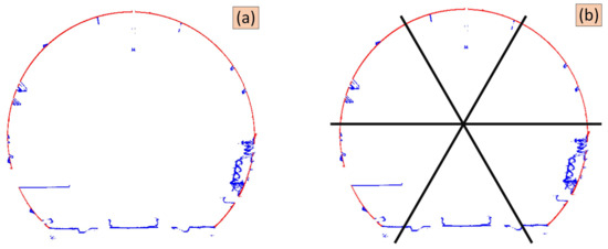 Based on the elliptic equation (Equation (6)), at least five observation points are required in a tunnel section to obtain the equation parameters. To avoid local fitting caused by the uneven distribution of selected observation values [34], the cross-section point cloud was divided in this study at 60° intervals. One point was selected from the other five parts, except the bottom part, to participate in the fitting to ensure that the calculated ellipse parameters approach the optimal value.