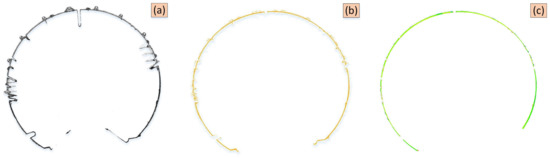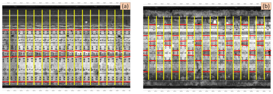 After the aforementioned process, most of the obvious error line segments are filtered out (Figure 7), but many similar line segments around the seam interfere with the accurate positioning of the seam. Therefore, the next step is to use a statistical method to obtain the optimal seam position (Figure 7), by traversing the candidate line segments and line-by-segment statistics and selecting the line with the largest number of pixels as the initial ring seam (Figure 7).