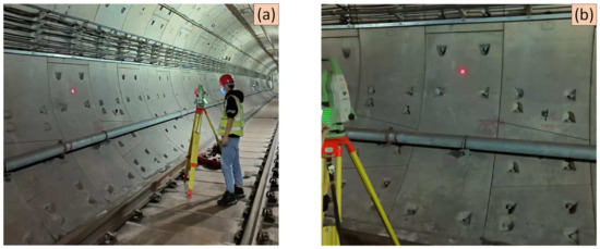 Manual method for tunnel convergence diameter measurement use total station (the red point represents the convergence point): (a) one convergence point is the left part of tunnel; (b) the other convergence point is the right part of the tunnel.
