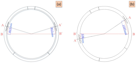 Continuous seam assembly adopts a simple direct measurement method. A chord length of 813 mm is measured from A or A’ down at the middle of the seam aforementioned the two side diameters, which are positions B and B’ at one end of the convergence diameter, in Figure 14.