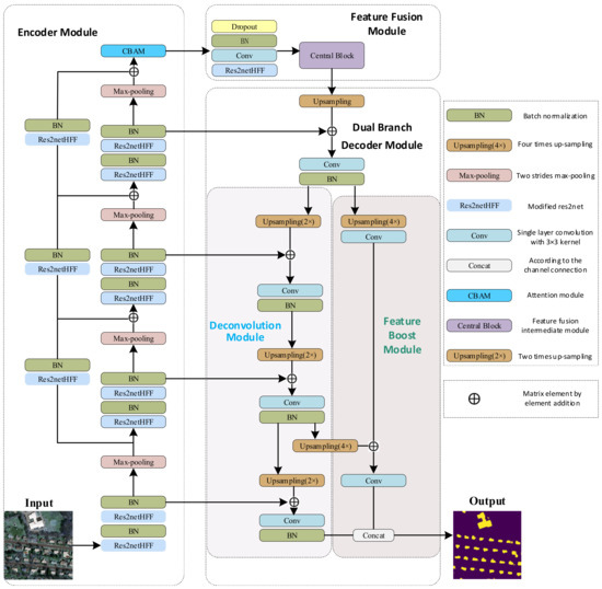 where the denotes the deconvolutional branch and represents the sum function of encoder block and decoder block features.