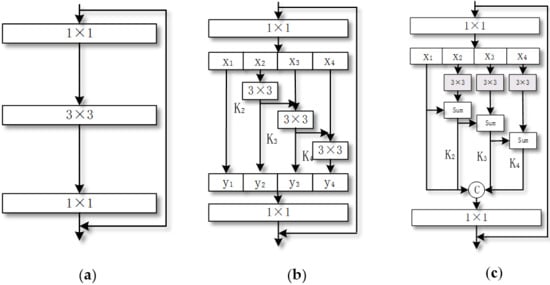 Improved Res2Net module. (a). ResNet [43]; (b). Res2Net [45]; (c). Res2Netplus.