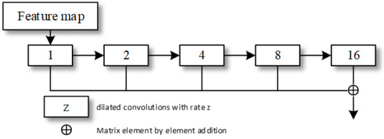 The authors of this paper tried to perform a large-scale extraction of the feature information extracted from the backbone network, that is, adding feature fusion in the middle layer of the network so that more semantic information could be extracted in a small area. As shown in Figure 5, the specific method consisted of expanding the receptive field of image feature extraction; using 512 3×3 convolution kernels; setting the sampling expansion rate sequentially to 1, 2, 4, 8, 16, and 32 for the convolution operation; and convoluting. The features are batch-normalized and finally activated by the ReLU activation function. The number of decoders corresponds to the number of encoders, and each decoder includes one deconvolution layer and two convolution layers. The deconvolution layer up-samples the features obtained in the previous stage twice and connects with the encoder of the same level to restore the image size of each layer in the encoder stage while performing feature extraction through two convolutional layers. The goal of this process is to fuse the characteristic information output with the deconvolution operation of different proportions and finally restore the original input image size, thereby preserving richer information. is used to represent the output after feature fusion. This feature fusion process can be expressed as: