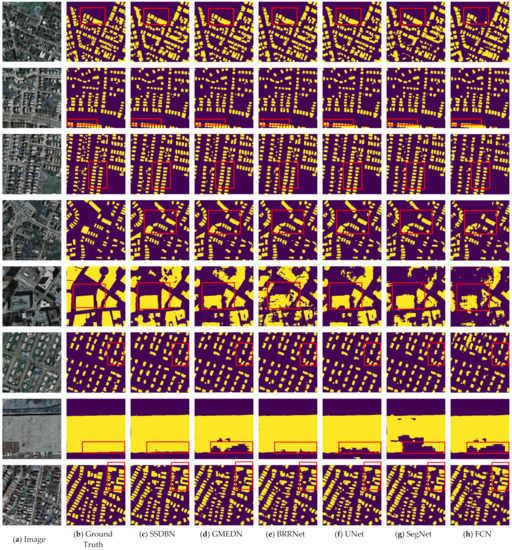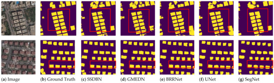 In Figure 7, the obvious improvements are marked with red boxes. One can see that SSDBN, BRRNet, and GMEDN worked well when the density of small buildings was high. However, UNet, SegNet, and FCN did not work well. When predicting large buildings, BRRNet, SSDBN, and UNet were better at preserving geometric details and contours. Overall, SSDBN was better at capturing multi-scale information than the other networks.