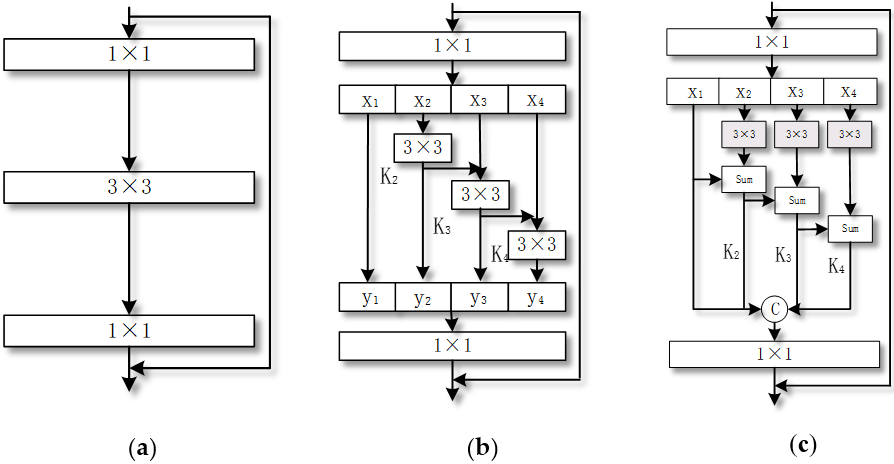 - As shown in Figure 2c, as with the original Re2Net, the high-dimensionality of the feature map is projected into the low-dimensional space through a 1×1 convolution kernel. Then, the obtained feature map F is equally divided into 4 parts according to the channel. The difference from the original version is that the output features obtained after each X input are subjected 3×3 dilated convolution and sequentially added. This process is repeated several times until all four feature parts are processed. Then, all features are combined, a 1×1 ordinary convolution kernel is used to adjust the channel, and the feature information is fused. We propose this modification due to the characteristics of high-resolution remote sensing images, which contain complex information, diverse texture feature types, and variability. The detailed information contained within them is very rich, and the image have multi-scale characteristics. The information content and the level of detail reflected by different scales are also different. Therefore, when each pixel in a low-dimensional space is input, the feature is extracted through a 3×3 dilated convolution. Through the function of the dilated convolution, the receptive field can be expanded and more detailed contextual feature information of different scales of the image can be captured, so each output feature can be added to obtain deeper multi-scale information of the high-resolution image. Our improved Res2Netplus formulas are shown in Equations (2) and (3), which are used as the most basic unit of the encoder part of the network model to replace the ordinary convolution in the backbone Xception network. At the same time, in order to test the effectiveness of the improved Res2Net, we conducted an experimental demonstration.