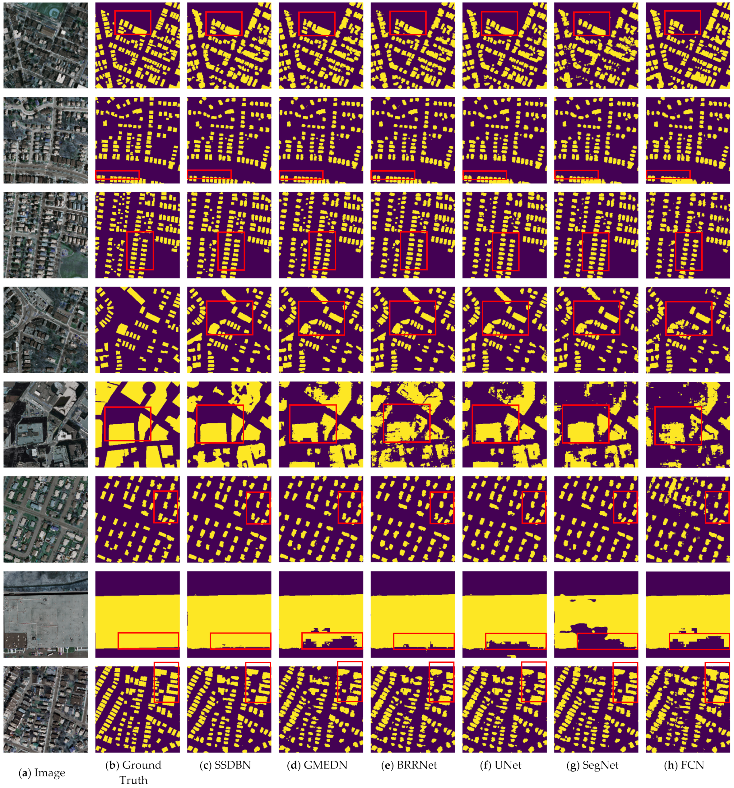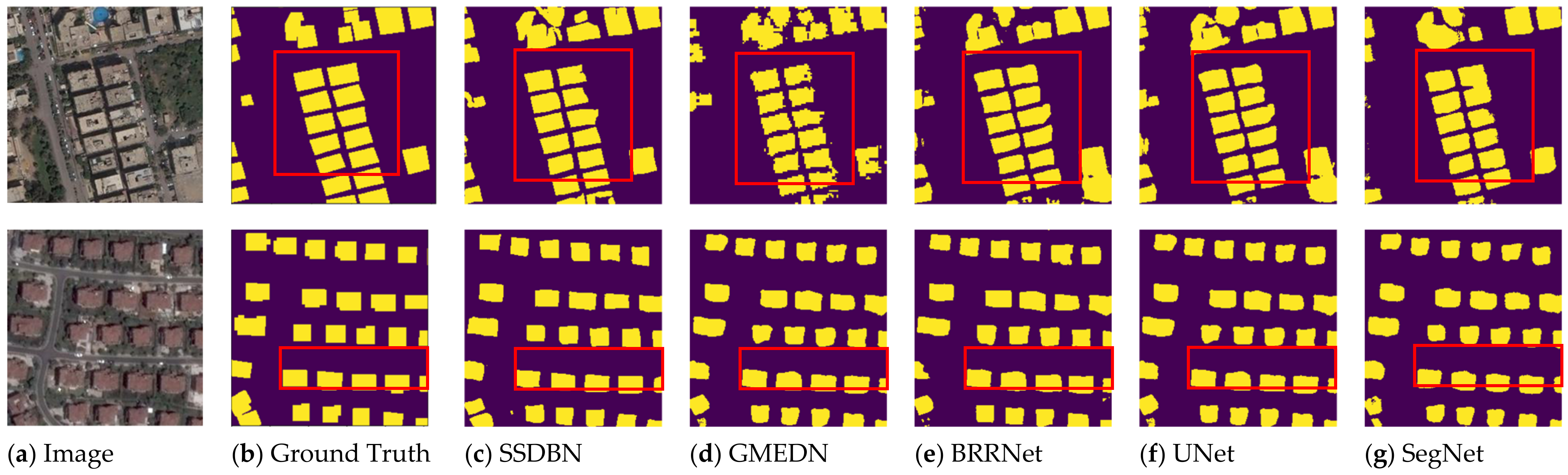 - BRRNet [51] uses a residual refinement network for post-processing; this network can effectively refine the edges of buildings and improve accuracy.