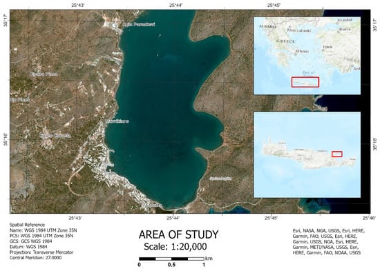 The study site is the bay of Elounda, located northeast of the island of Crete in Greece. The site is located between 35°15′25″–35°17′7″ N and 25°43′17″–25°44′35″ E (WGS 84) as can be seen in Figure 1. The broader area was an important center and a strategic port of the island of Crete in ancient periods. According to the archaeological data, the area exhibited a continuous habitation spanning from the Minoan to Venetian period. The most relevant architectural constructions, however, were created in the Hellenistic, Roman, and Early Byzantine periods.