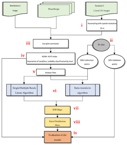 Seven basic steps of estimating bathymetry were acknowledged to this challenging study area. The pre-processing steps are a crucial component of the methodology for estimating bathymetry. The first pre-processing step concerns the geometric, radiometric, and atmospheric correction of satellite images. The provider of the Worldview 2 and PlanetScope images gave calibrated the satellite images, while the medium resolution Sentinel 2 image was downloaded as the bottom of the atmosphere product. In addition, for the Sentinel-2 image, the resampling of all Sentinel 2 bands using a referenced band with a 10 m spatial resolution was applied in the Sentinel Application Platform (SNAP) software (Figure 3—i).