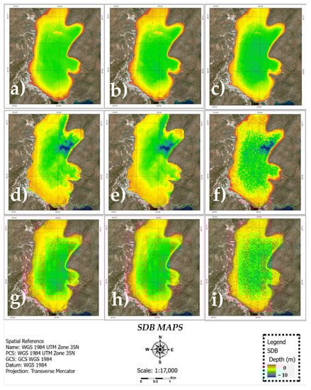 SDB maps obtained by algorithm/sensor are listed as: (a) SBLA/Worldview 2; (b) MBLA/Worldview 2; (c) RTA/Worldview 2; (d) SBLA/Sentinel 2; (e) MBLA/Sentinel 2; (f) RTA/Sentinel 2; (g) SBLA/PlanetScope; (h) MBLA/PlanetScope; (i) RTA/PlanetScope.