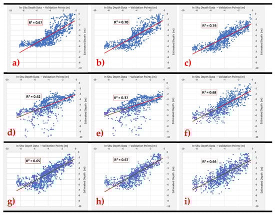 Correlation between observed depths (validation points) and extracted depths obtained by each algorithm/sensor, listed as: (a) SBLA/Worldview 2; (b) MBLA/Worldview 2; (c) RTA/Worldview 2; (d) SBLA/Sentinel 2; (e) MBLA/Sentinel 2; (f) RTA/Sentinel 2; (g) SBLA/PlanetScope; (h) MBLA/PlanetScope; (i) RTA/PlanetScope.