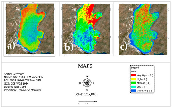 The following results present the areas of water turbidity and evaluate the bathymetrical results using the validation points and the error distribution maps. Consequently, the areas with turbidity for each satellite image were identified and classified using the NDTI indices. The water areas with extreme turbidity levels may have more radiation response of red light than green light. A prediction of an indicator of water quality was determined by classifying the NDTI values into five equal intervals categories. The results applying the NDTI indices for each satellite image are presented in Figure 6.