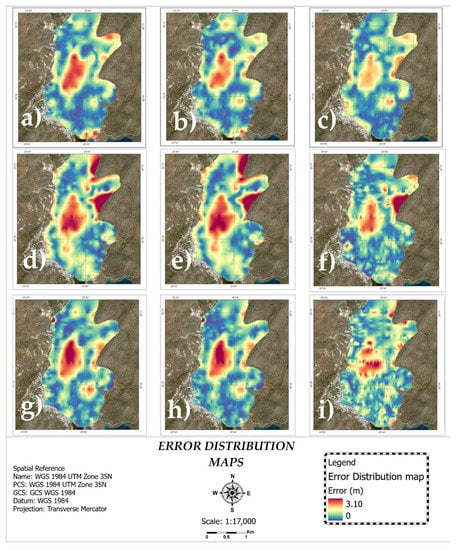 Subsequently, based on the SDB results, error distribution maps were created to study the depth and areas with the highest errors presented on bathymetric maps. Subsequently, using the ArcGIS Pro environment, nine error distribution maps were created by linear interpolation of the difference of in situ depth data and satellite bathymetry’s depth values, as shown in Figure 7. Each error distribution map refers to the use of a different algorithm/sensor.