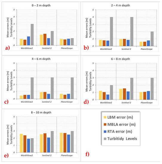The next step of this research was the evaluation of the bathymetric results considering the three methods and turbidity. Subsequently, a comparison of the error about turbidity and depth for each method and satellite was achieved by creating graphs, as shown in Figure 8. The diagrams were created, distributed by two meters depth using the validation points and extracting the errors of Error Distribution Maps and the Turbidity maps. The x-axis of the diagram presents the type of satellite image, and the y-axis presents the values of mean errors by each method (meters) and the level of turbidity.
