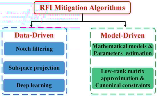 RFI mitigation plays an increasingly important role in SAR systems, as it can effectively alleviate the impact of RFI on SAR image quality and improve the precision of SAR image interpretation. Furthermore, some RFI mitigation algorithms have been exploited in the SAR platforms, such as Sentinel, to promote the ability of information acquisition. Over the past few decades, there has been an intensive development of RFI mitigation algorithms, which can be summarized into two categories: data-driven algorithms and model-driven algorithms. These are depicted visually in Figure 1.